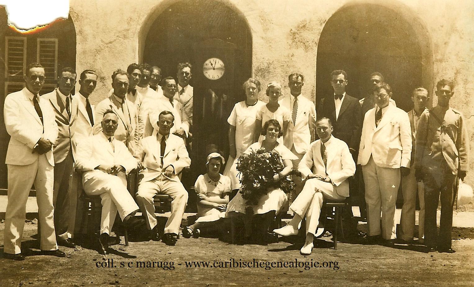 Ambtsjubileum Landsradiodienst J.W.P. Peiliker (zittend 2de van links) en Louis C.H.M. Bergman (staand links naast het staand horloge), Curaçao 25-08-1934 (collectie Louis (Manu) Bergman)