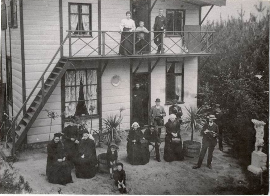 Groepsportret voor het boshuis in het Ulvenhoutsebos van wonderdokter Colson, ca. 1905-1915 (Breda Beeldcollectie)