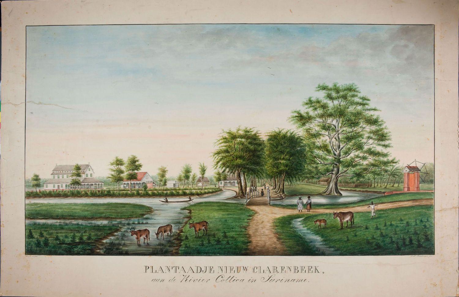 Waterverfschildering van plantage Nieuw Clarenbeek te Suriname, eigendom van C.F. Bilborg, A.L. Brockmann,1860 (Tropenmuseum)