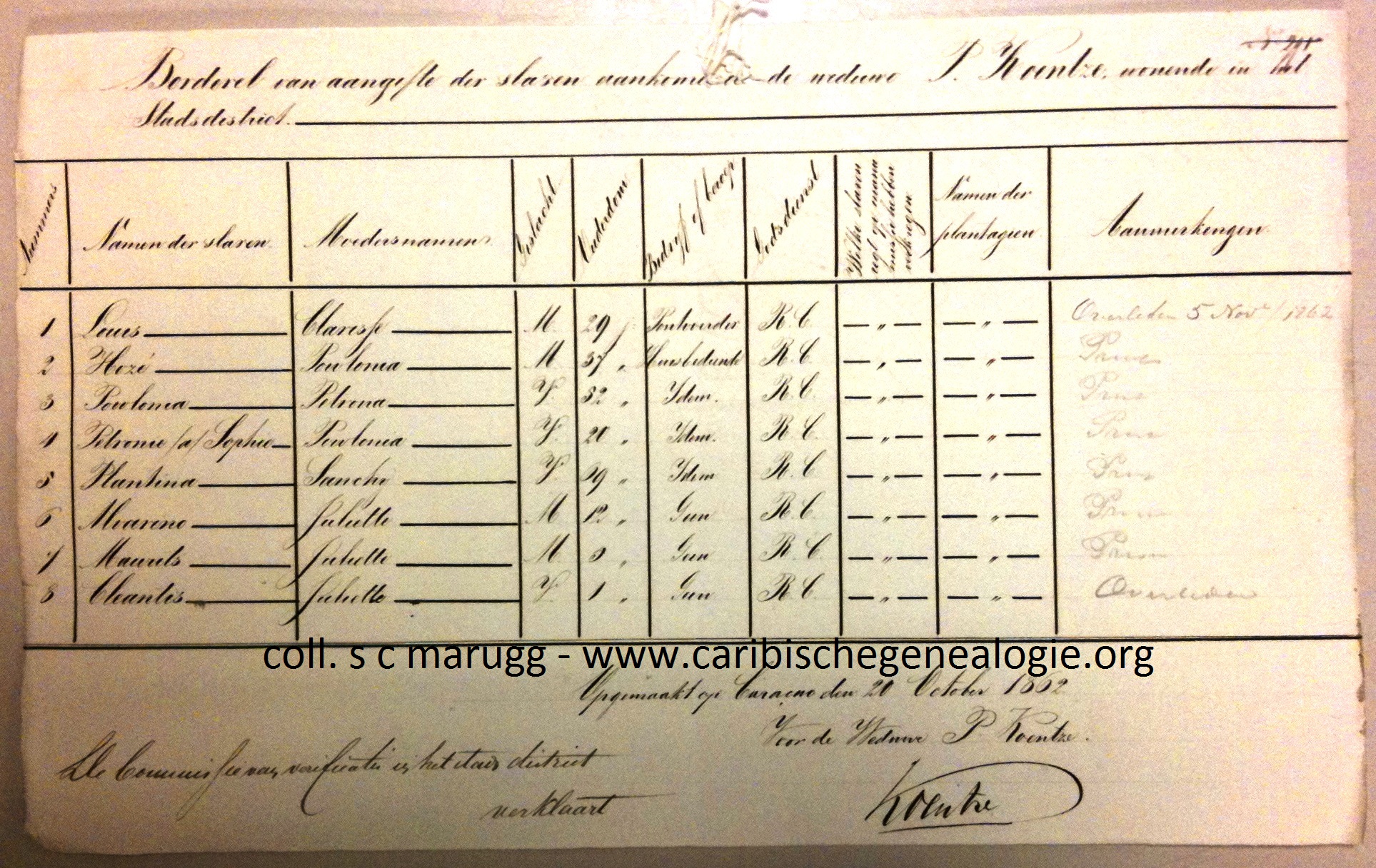 - MARIA THOMASA geb. Curaçao 20-12-1827, ged. R.K. Curaçao 26-01-1828 (get. Joannes Hoevertsz en Clara Victoria Penso Spencer), in het doopboek wordt haar moeder vermeld als Maria Raphaela servi P. Koentze. Bij de slavenemancipatie in 1863 wordt zij niet meer vermeld.