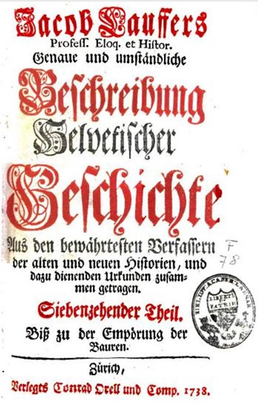 Dr. Johann Jakob is de grootvader van prof. dr. Jakob Lauffer die bekend staat als de grondlegger van de geschreven Zwitserse geschiedenis door zijn werk Genaue und umständliche Beschreibung helvetischer Geschichte … Zürich, 1736-1739. Hij werd geboren te Zofingen op 25-07-1688. Zijn ouders wilde dat Jakob predikant zou worden en daarom studeerde hij theologie aan de universiteit van Bern, Halle en daarna Utrecht. Tijdens zijn studie bezocht hij ook nog andere Duitse, Nederlandse en Franse universiteiten. In 1714 publiceerde hij te Amsterdam Atheus amens, een werk over atheïsme. In 1717 keerde hij terug naar zijn geboorteplaats en werd gekozen tot predikant. In 1718 aanvaardde hij het professoraat in de geschiedenis en eloquentie aan de universiteit van Bern. Hij was één van de grondleggers van de eerste literaire sociëteit en hij correspondeerde veel met Johann Jakob Bodmer (professor in de Zwitserse geschiedenis en politiek, 1698-1783) uit Zürich. In 1724 werd hij officieel aangesteld als kroniekschrijver van de Bernse geschiedenis – toen tot het jaar 1616 gecompleteerd. Jakob Lauffer heeft door zijn vroegtijdige dood de kronieken tot het jaar 1657 kunnen schrijven. † Bern (na een ongelukkige val van de trap) 26-02-1734.
