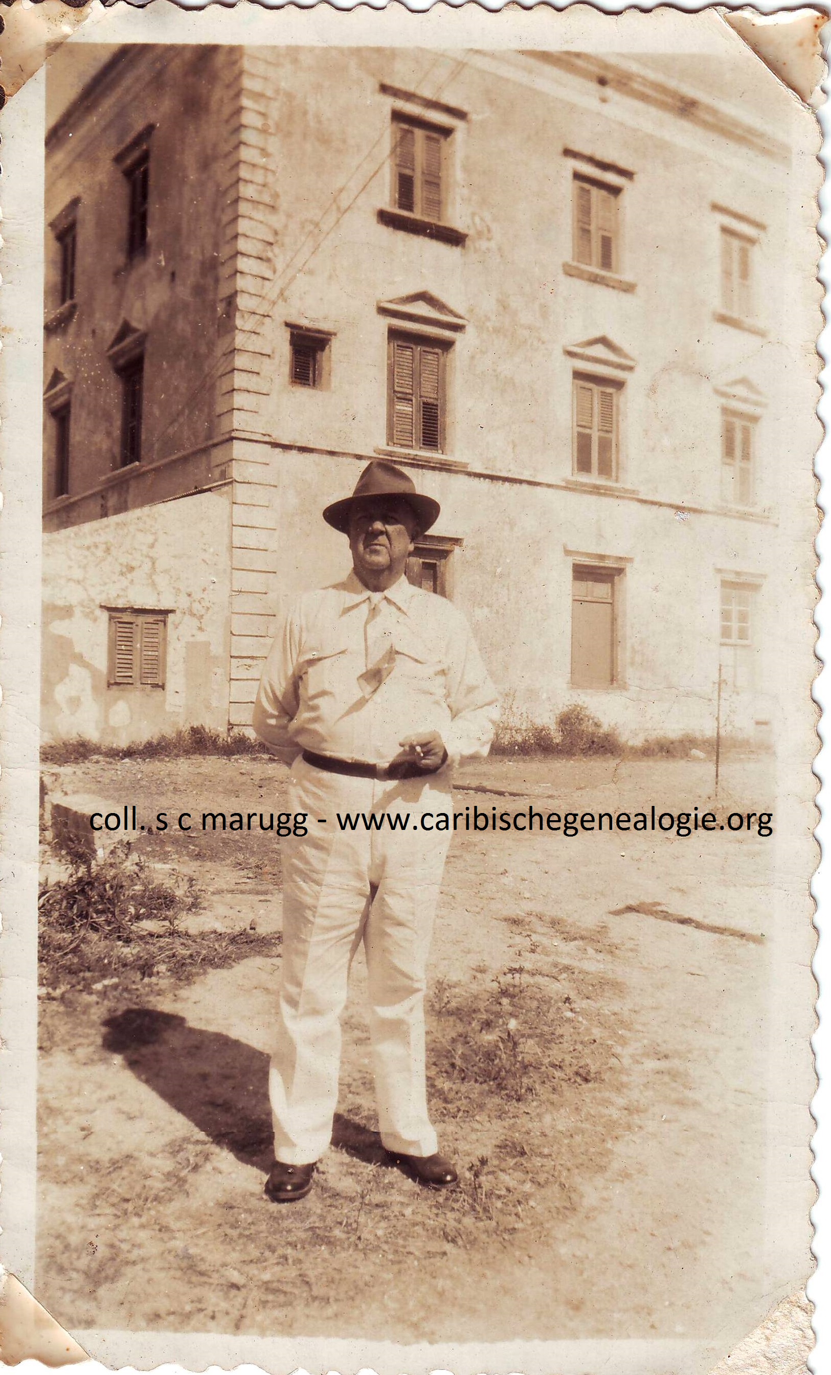 VIII.. ALBERT WILHELM HOLLANDER MARUGG geb. Curaçao (3de district) 06-11-1895, ged. Prot. Curaçao 05-02-1899 (huisdoop, get. Theodorus Cornelis Boskaljon en Louisa Augustina Frederika Redelfina Fijnje), commies-verificateur der belastingen, hoofd pakketpostdienst posterijen te Curaçao, vrijmetselaar Loge Igualdad, mede-oprichter Vrijwilligers Korps Curaçao (1929), † Curaçao, Groot Kwartier 15-06-1958, begr. Curaçao Prot. kerkhof Otrobanda, grafkelder A.W.H. Marugg, 1ste relatie met MARIANNE LAUFFER geb. Curaçao, landhuis Heintje Kool (MD 1ste district) 22-06-1893, † Curaçao (stadsdistrict) 12-05-1920, begr. Curaçao R.K. kerkhof Otrobanda grafkelder i.o.v. (neef) Van den Wall Arnemann, dr. van Jacob Lauffer, koopman, goudsmid en Adèla Clemencia Kroon, tr. (Bs en Prot. Kerk) Curaçao (thuis, stadsdistrict) 10-04-1926 (get. Willem Frederik Hendrik Hoogenbergen, 43, koopman, Charles Rudolf van Giersbergen Jacobs, 31, gouvernementsambtenaar, Johann Isaac Abraham Marugg, 33, koopman, Frederik Alexander Hollander, 48, gouvernementsambtenaar) JULIA MARIA SILLÉ geb. Curaçao 14-09-1903, R.K., † Curaçao 30-10-1978, begr. Curaçao Prot. kerkhof Otrobanda, grafkelder A.W.H. Marugg, dr. van Anthonie Jan Hendrik Sillé en Anastacia Girigoria [Curaçao, Groot Kwartier].